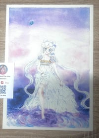 Step into a dreamlike moment with this delicate watercolour illustration of Princess Serenity, inspired by SM. Captured in a quiet, ethereal scene, Serenity is shown holding her iconic white dress as she gently steps into shimmering water. Behind her, a soft purple sky stretches into the cosmos, with the Earth glowing peacefully in the distance.